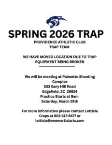 Trap Shooting Location Change!! By providenceathleticclub | March 22, 2026 Due to a broken trap machine, Trap Shooting will now be meeting at NWTF Palmetto Shooting Complex, 535 Gary Hill Rd, Edgefield, SC 29824 If you have any questions, please contact Letticia Craps at letticia@onemartialarts.com Posted in Fall Trap Shooting News & Updates, News & Updates, Spring Trap Shooting News & Updates
